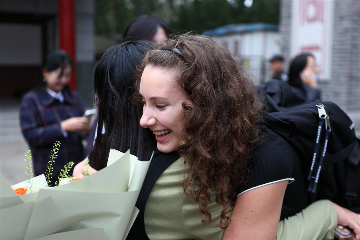 上午8:50分,具有百年女中光辉历史的畅叙楼前暖意浓浓。暑期前往德国访问的我校师生与接待家庭家长手持鲜花满心欢喜地等候着远道而来的德国师生。随着满载嘉宾的大巴车出现在校园入口,学校腰鼓队敲响了震耳欲聋的激昂鼓点,身着传统民族服装的队员们舞起了喜气的陕北秧歌,欢快节奏瞬间点燃现场气氛。真挚的笑容、温暖的拥抱让校园处处洋溢着跨国友谊的温馨。