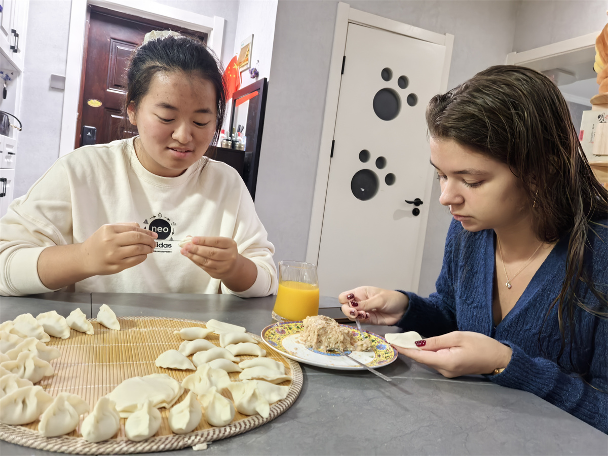 10月12日是德国学生的家庭日,厨房里的互动成了最生动的文化课堂。德国学生跟着搭档学擀饺子皮,愉快的笑声伴随饺馅的清香,荡漾在温馨的厨房里。当热腾腾的饺子出锅,沾上料汁,德国学生赞不绝口,真切感受到搭档家的温馨。
