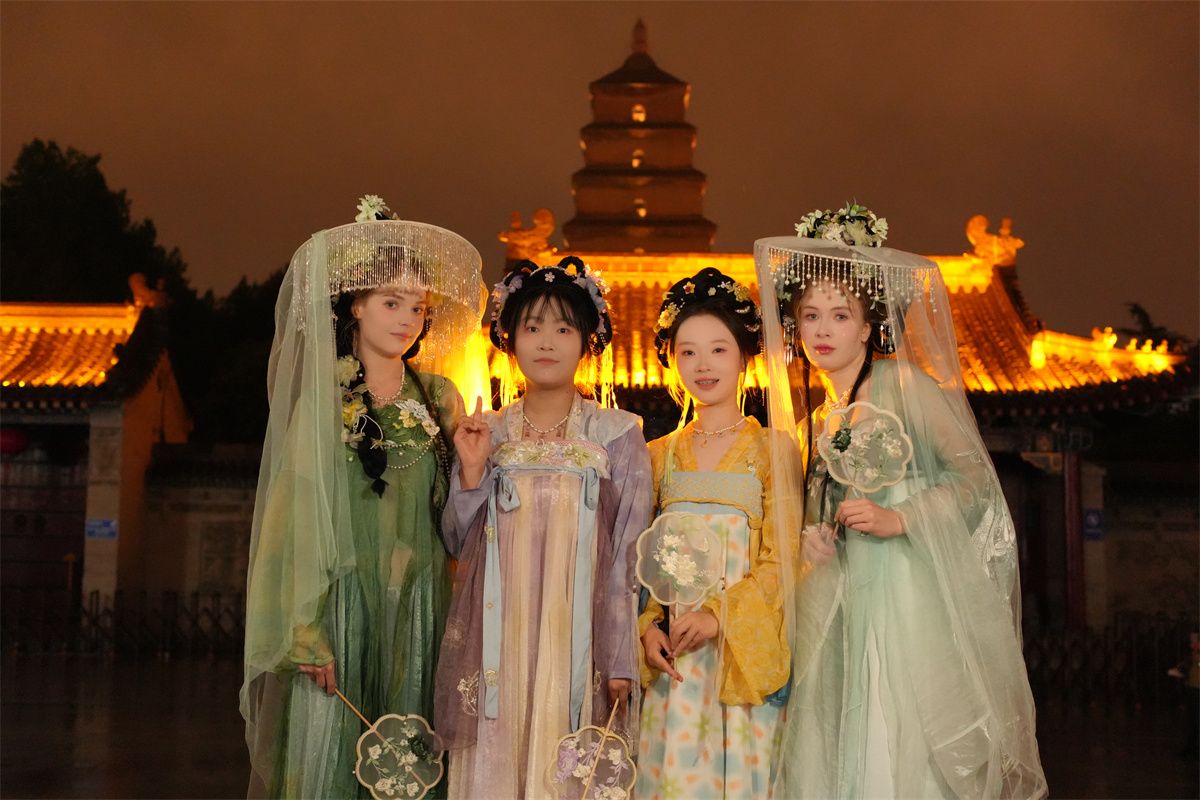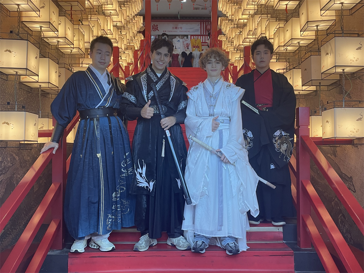 在汉服体验店,学生们帮德国搭档穿上襦裙、戴好发簪。一起缓步行走在西安古城墙上,微风拂过耳边,仿佛是跨越千年的相遇。