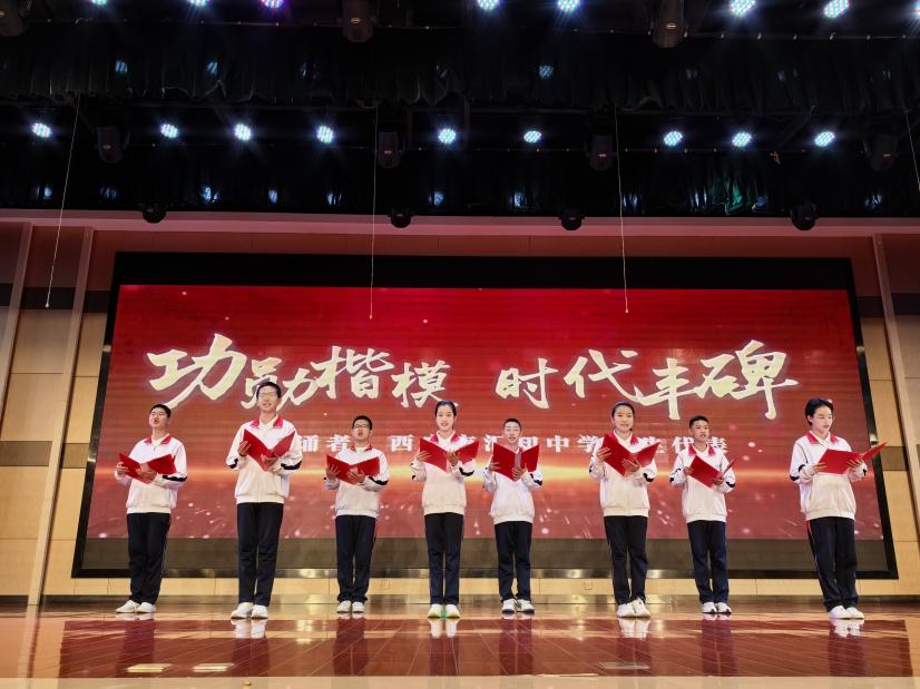 在劳模精神的感召下,西安市汇知中学初二年级学生代表献上诗朗诵《功勋模范,时代丰碑》。铿锵的语句、真挚的情感,传递出年轻一代对劳模的礼赞与追随。随后,学生为劳模献花、合影,将敬意化为行动。