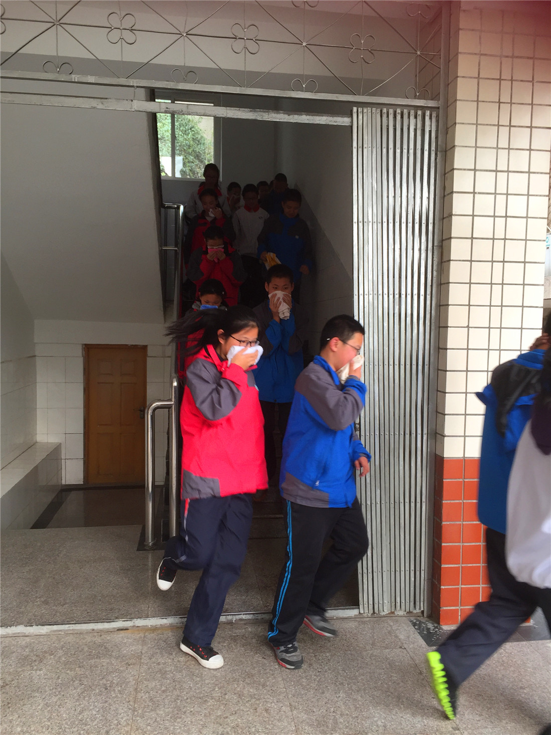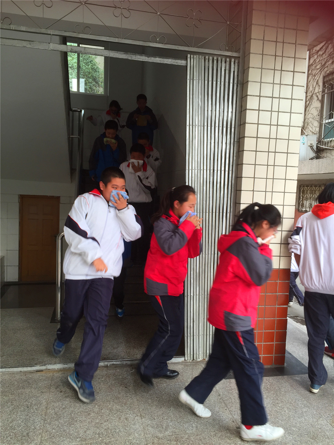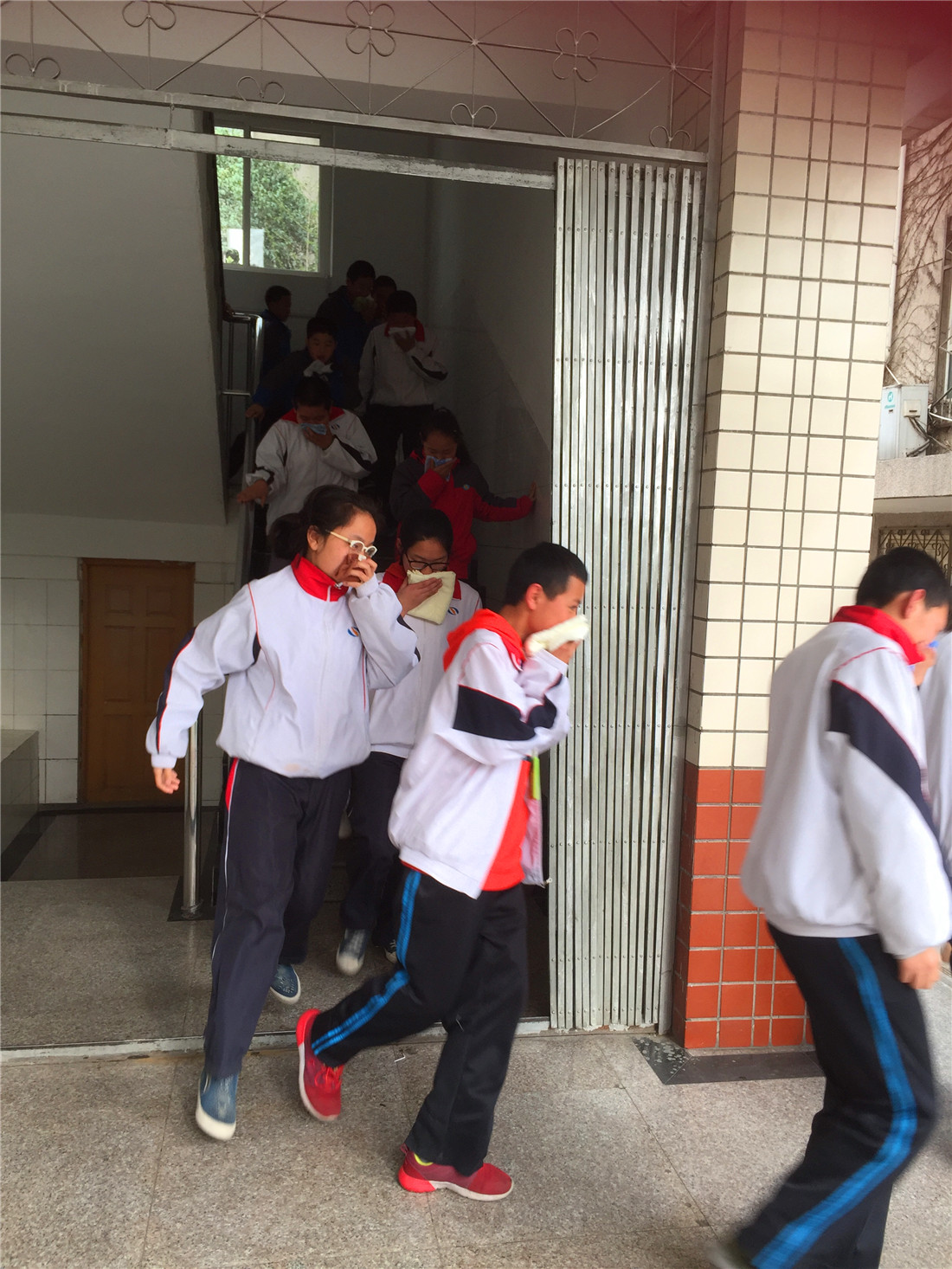 16:30广播发出逃生指令:“请大家注意,现在学校一教室突发火灾,请大家迅速疏散。”各位老师迅速到达指定岗位,引导楼内学生快速疏散,各班学生在班主任的组织下沿疏散逃生路线,快速有序撤离现场直至汇知操场指定位置。在逃生过程中,同学们用毛巾捂鼻,弯腰低姿,快速有序的按疏散路线撤离至安全地点,随即迅速集合、清点人数,向总指挥报告。经统计,本次参与演练的学生应到1006人,实到1001人,安全撤离1001人,无人受伤,师生全部安全疏散完毕,整个活动迅速、有序。