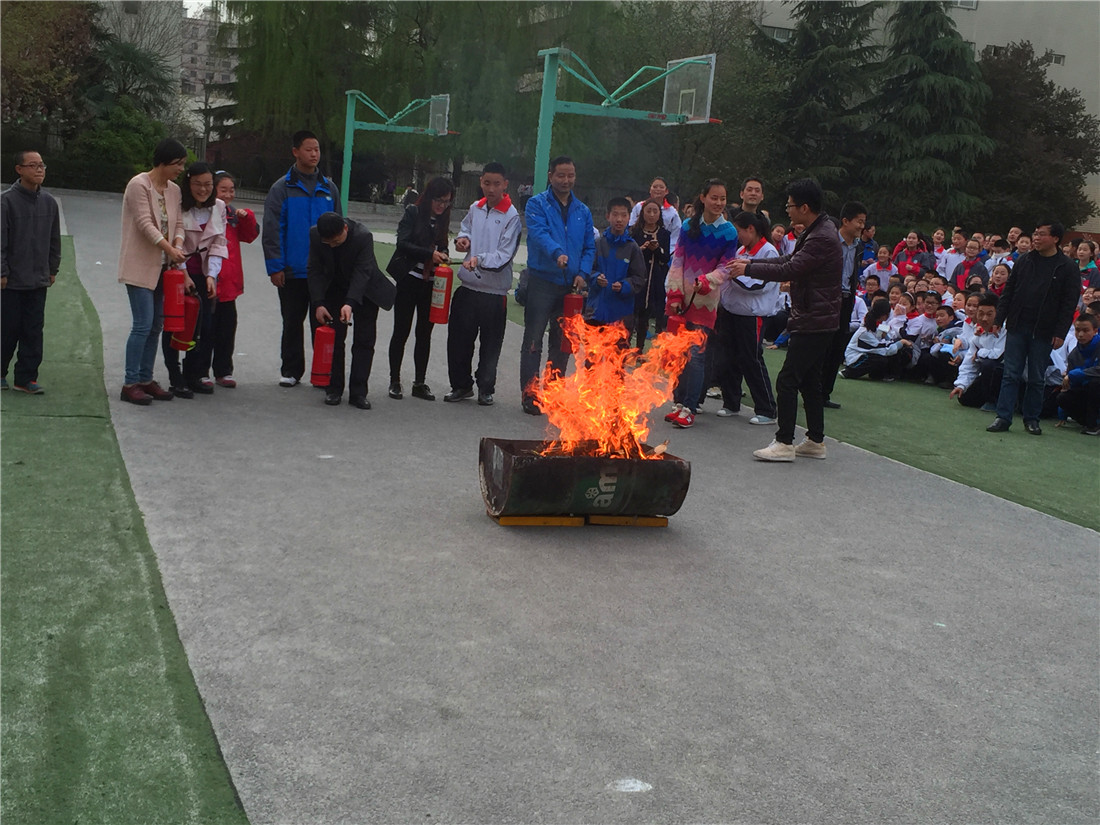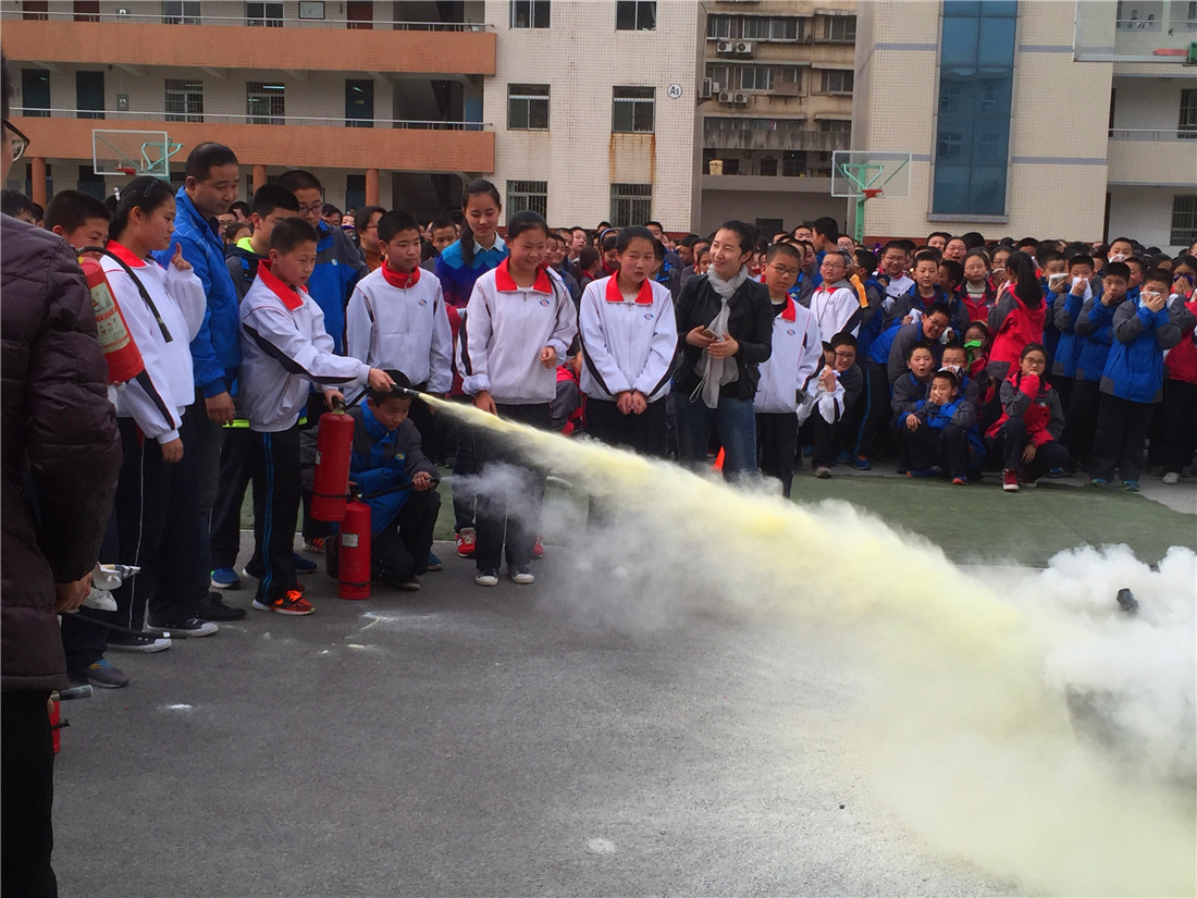 接着,师生们认真观摩了如何正确使用干粉灭火器灭火,并亲自体验了现场灭火的过程。总指挥向师生介绍了手提式干粉灭火器的正确使用方法及注意事项,告知大家在使用前要将筒体上下颠动几次,使干粉松动,这样喷射效果会更好;在喷射时,应站在火源的上风方向对着火焰的根部平射,并请各班的师生代表上台按照灭火器的正确使用步骤和方法进行实际操作。